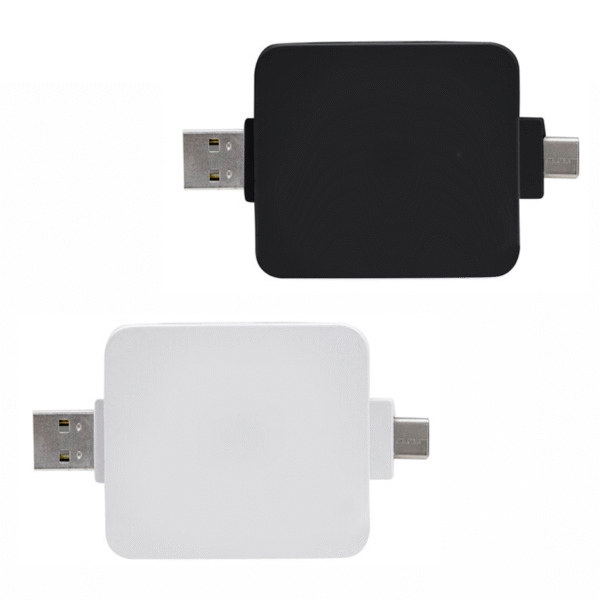Mini adaptador HUB multipuerto. Entrada: 1 x USB-A / 1 x USB-C. Salida: 2 x USB-A / 2 x USB-C con conectores rebatibles.