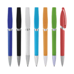 Plástico. Apertura retráctil con pulsador. Clip plástico, color plata en punta y cuerpo. Tinta negra.
