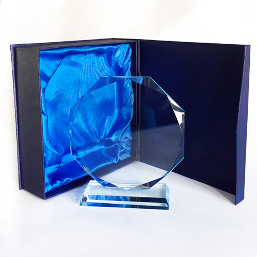 Galvano octágono de cristal con base personalizado incluye estuche azul.
