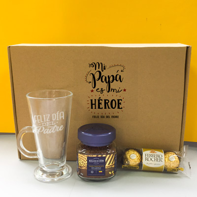 Gift Box que incluye café instantáneo chocolate, 3 bombones Ferrero y un taza cónica de vidrio personalizada.