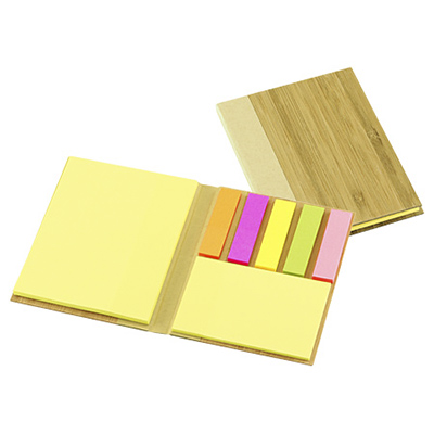 Memo Set con Tapas Duras enchapadas en madera de Bamboo grabado con logo o nombres. Incluye 50 post-it amarillos grandes, 25 post-it amarillos medianos y 125 banderitas adhesivas de colores.