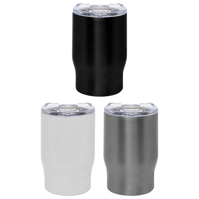 Mug metálico grabado, acero inoxidable. Doble pared. Tapa plástica transparente a rosca anti derrame. Ø 8,5 x 13,3 cm.