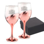 Hermoso set de 2 copas pie plateado, cada copa puede ser grabada con un mensaje personalizado, presentación en caja negra.