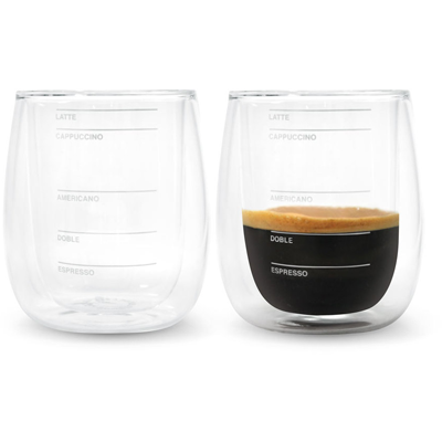 Vidrio de Borosilicato. Set de dos vasos doble pared con cinco marcas de medidas de cafe para probar y elegir el tipo de café ideal para cada momento. La caja incluye las proporciones para una correcta preparación. Presentación en caja de regalo.