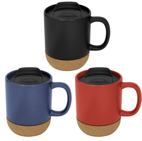 Taza con tapa. Tapa plástica a presión color negro con anillo de silicona. Base de corcho. Pintura con acabado mate. Producto apto para microondas siempre retirando la base de corcho.