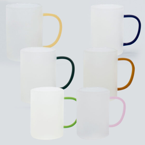Taza de vidrio frosted personalizada, con color en el asa, apta para microondas y lavavajillas.