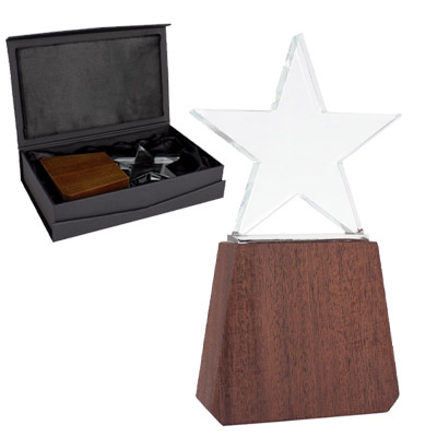 Trofeo de Madera y Cristal «Lonely Star» Corporativo, base de madera barnizada y estrella de cristal en su parte superior. Presentación en caja de cartón forrado negro con cierre imantado, interior acolchado de espuma y tela poliéster satinado negro, con troquel.